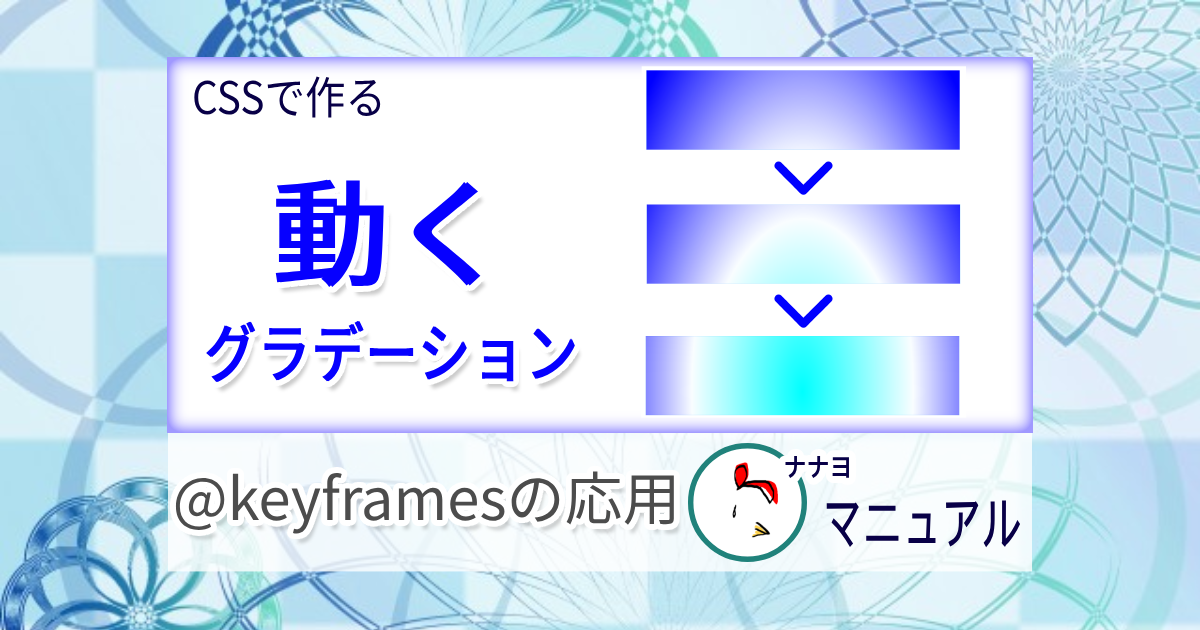 HTML動くグラデーション「CSS」ナナヨ マニュアル [CSSで作る動くグラデーション]このページはマジで!英語が苦手なナナヨが、ホームページ作成に必要なHTMLとCSSの基本と応用を快適に使う為、忘れないように作ったメモページです。 2023.12.22 2024.02.01HTMLHTML&CSS