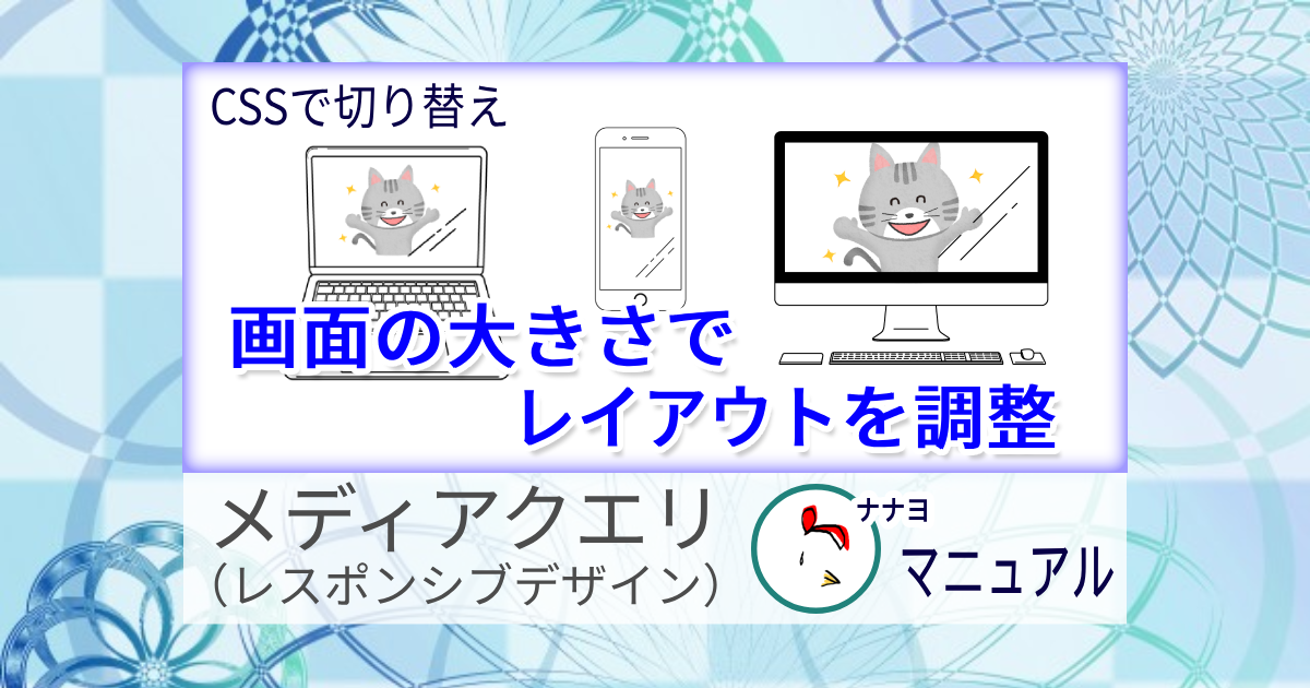 HTMLメディアクエリ「CSS」ナナヨ マニュアル [ブラウザの大きさによって、スタイルシートを切り替え]このページはマジで!英語が苦手なナナヨが、ホームページ作成に必要なHTMLとCSSの基本と応用を快適に使う為、忘れないように作ったメモページです。 2024.01.11HTMLHTML&CSS