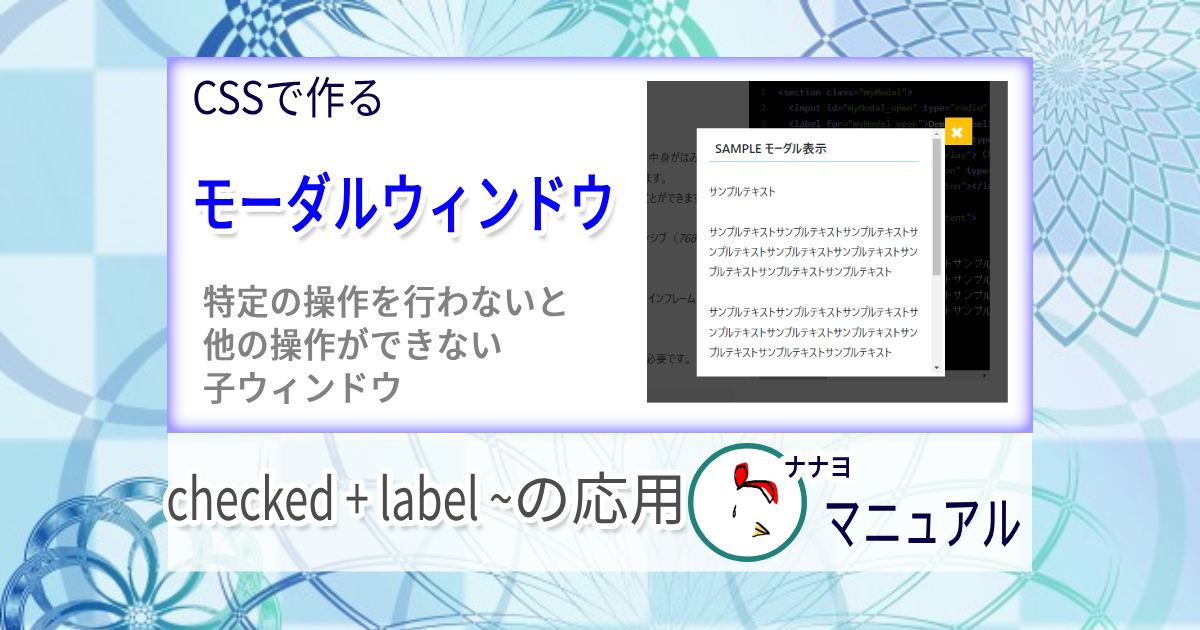 HTMLモーダルウィンドウ「CSS」ナナヨ マニュアル [CSSで作るモーダルウィンドウ]このページはマジで!英語が苦手なナナヨが、ホームページ作成に必要なHTMLとCSSの基本と応用を快適に使う為、忘れないように作ったメモページです。 2023.12.21 2024.01.11HTMLHTML&CSS